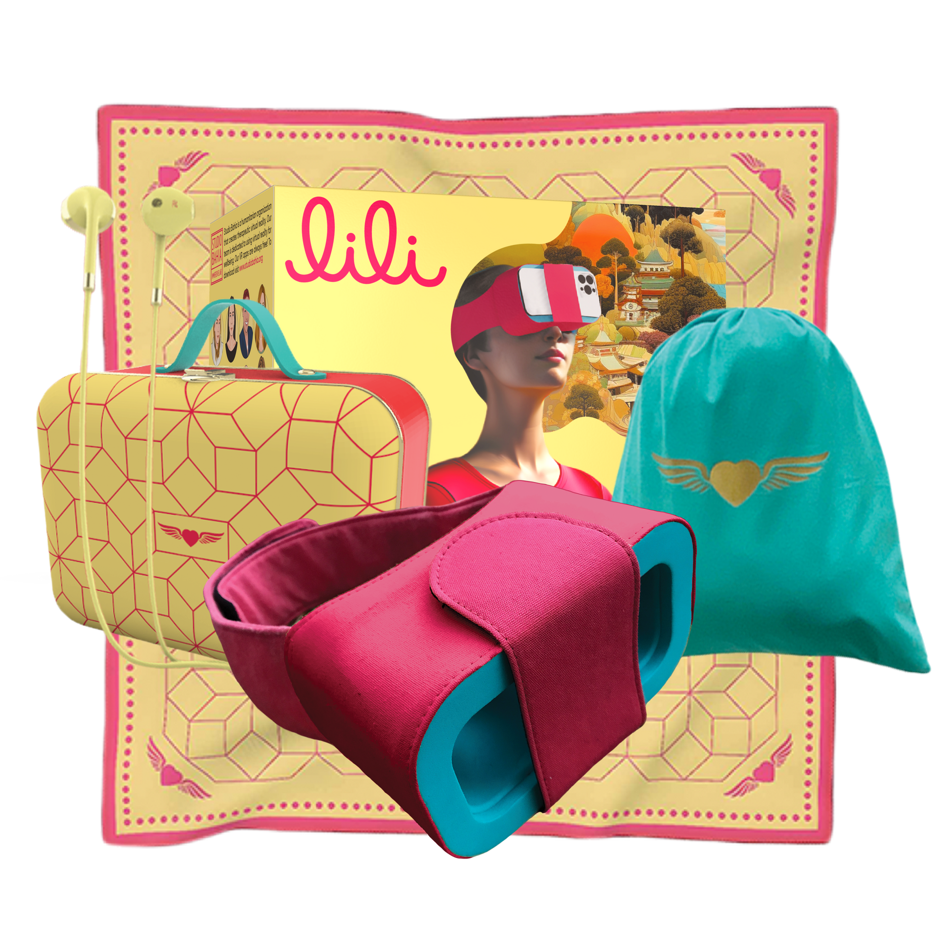 Lili headset comes with earbuds, bandana, lunch case, and backpack. Buy One Lili VR we Give One to hospitals, foster care, and refugee camps. All apps are always free.